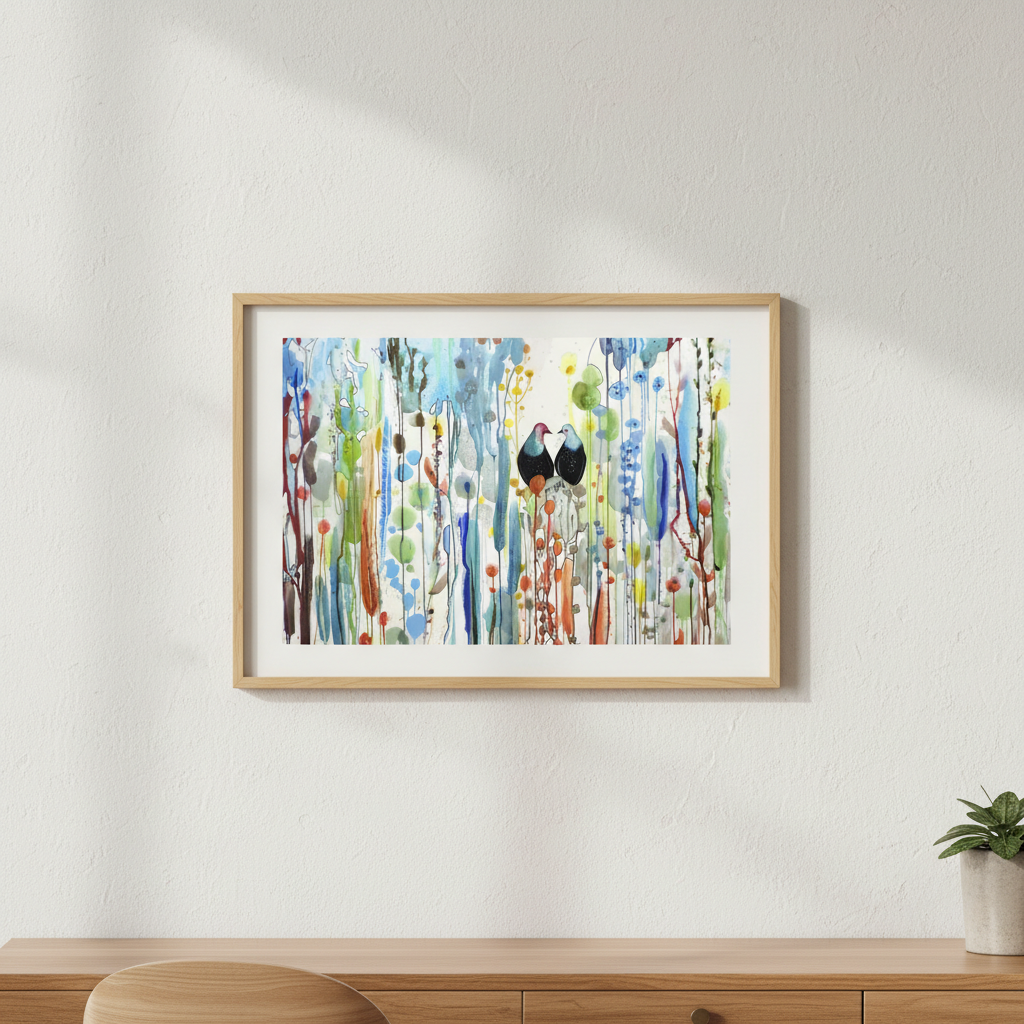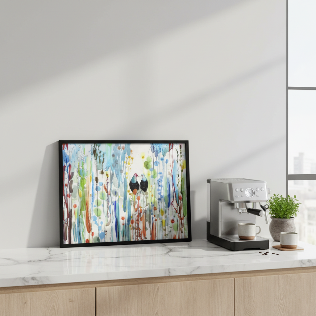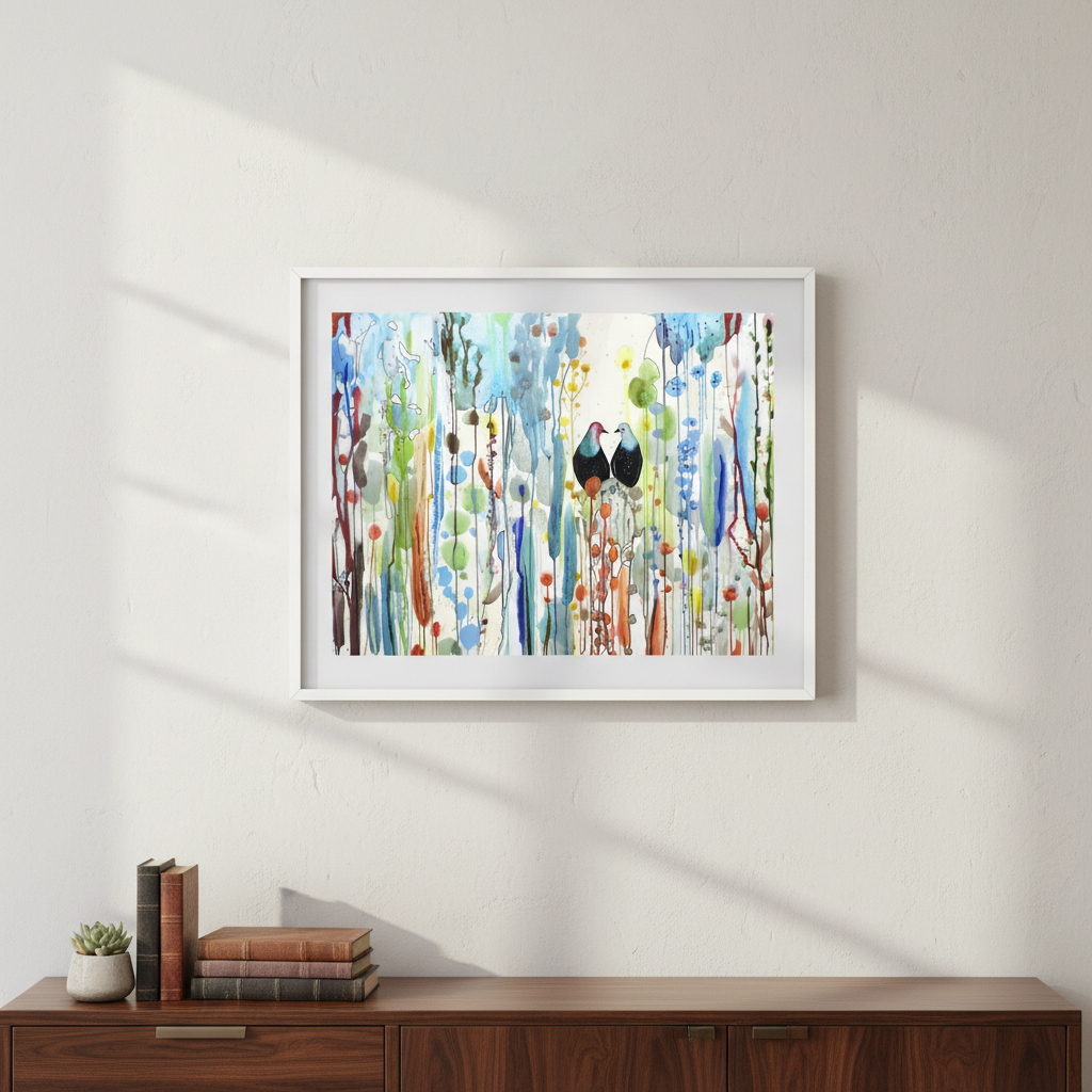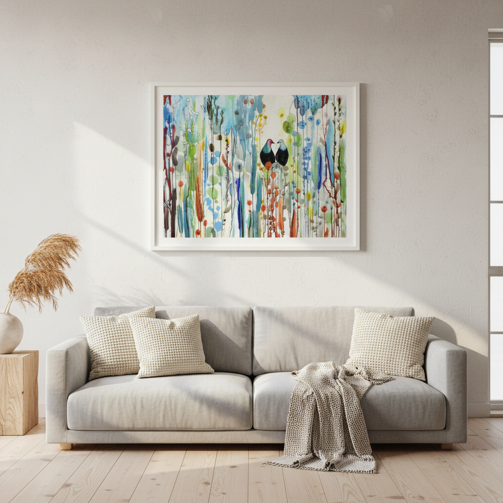 La Belle Histoire captures a moment of natural beauty through contemporary artistic expression. Two birds take centre stage against a dynamic composition of vibrant abstract paint splashes that dance across a clean white canvas. The interplay between the delicate wildlife subjects and the bold, expressive colour work creates visual intrigue—offering a sophisticated piece that bridges realism with modern abstraction. Perfect for spaces seeking artwork that sparks conversation while maintaining refined aesthetic appeal. By Sylvie Demers.