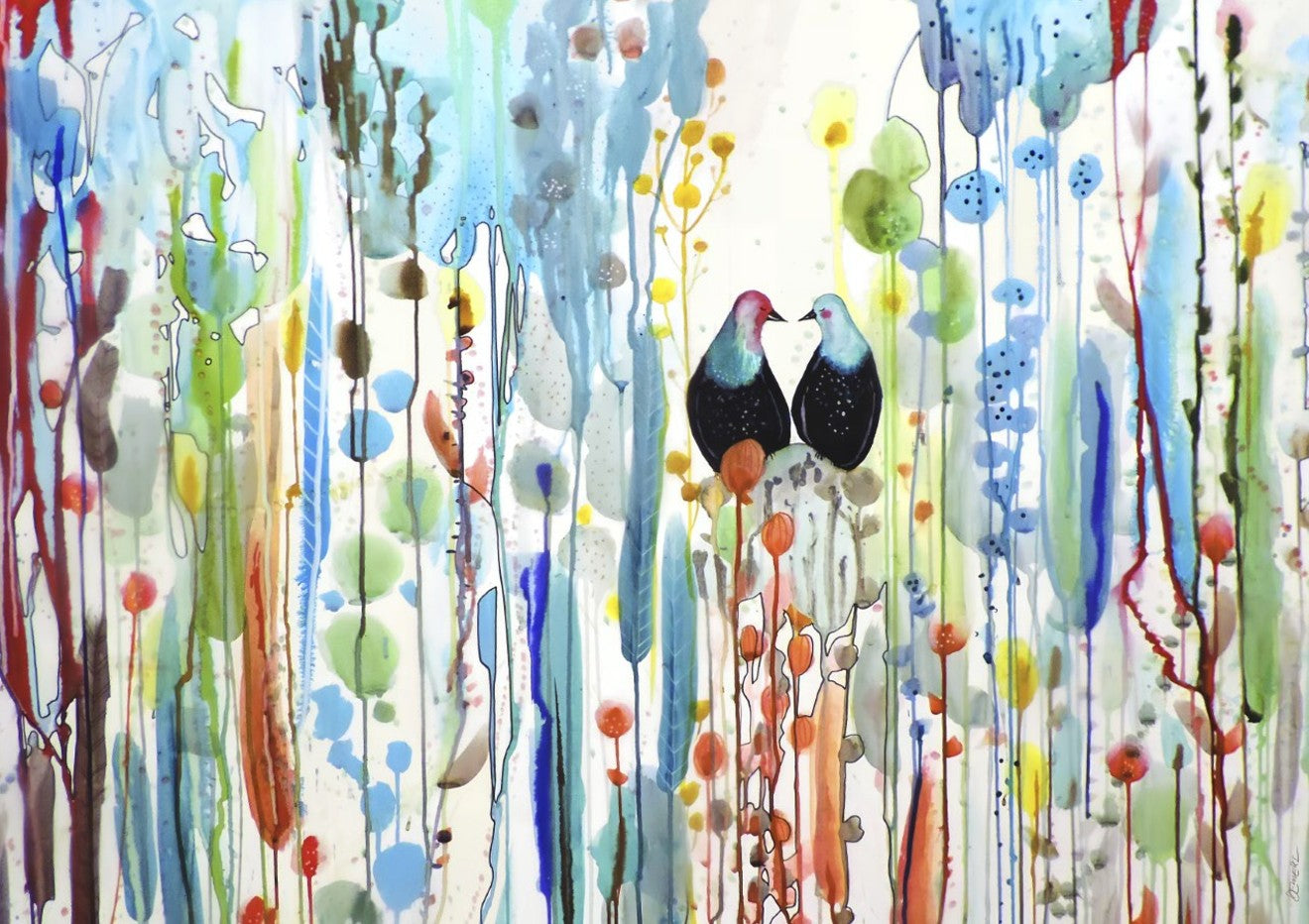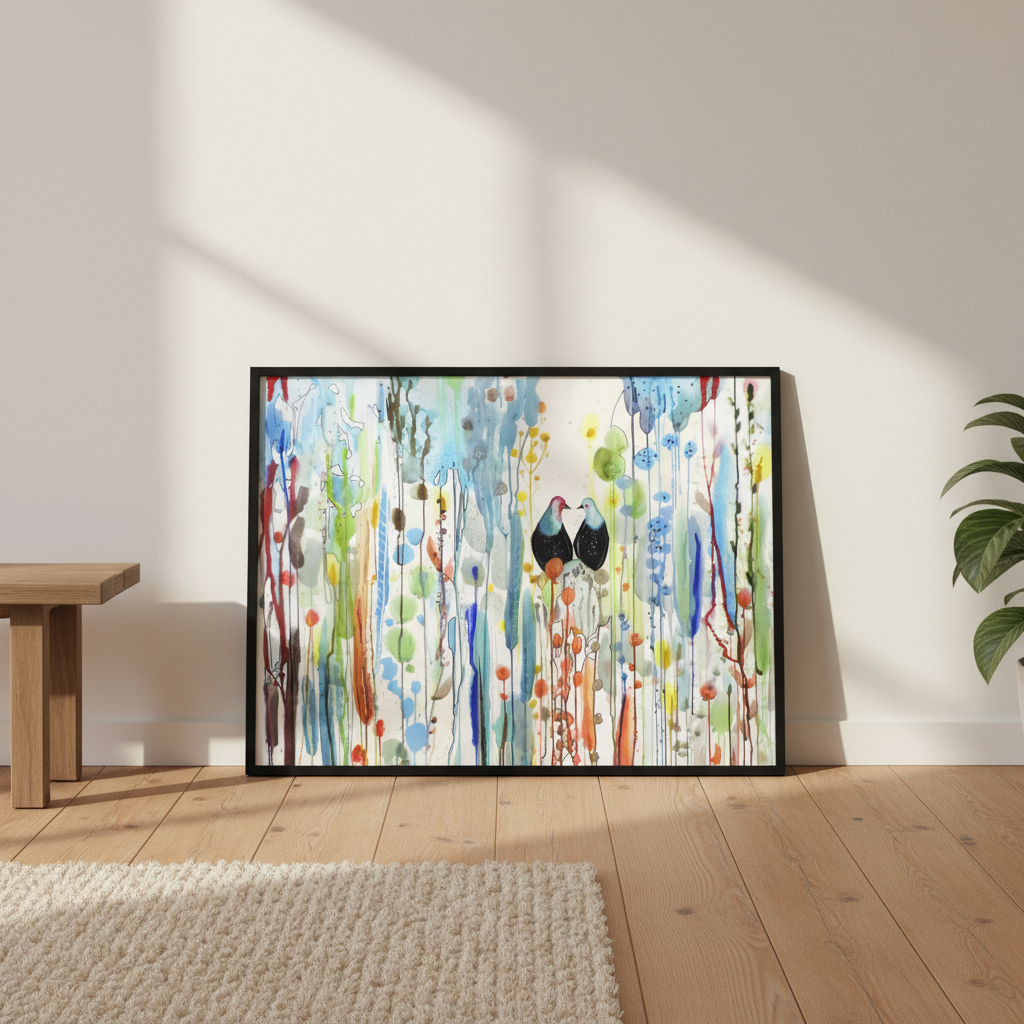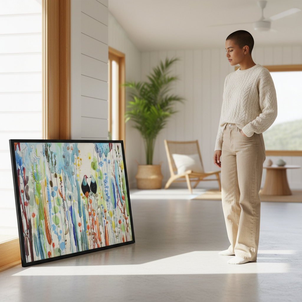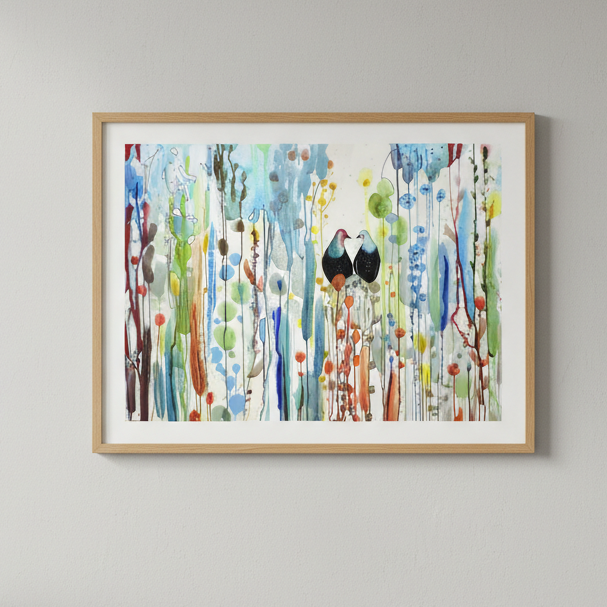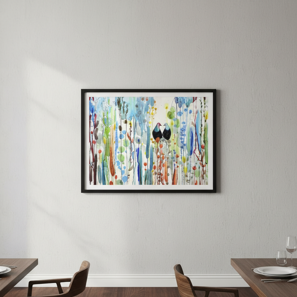 La Belle Histoire captures a moment of natural beauty through contemporary artistic expression. Two birds take centre stage against a dynamic composition of vibrant abstract paint splashes that dance across a clean white canvas. The interplay between the delicate wildlife subjects and the bold, expressive colour work creates visual intrigue—offering a sophisticated piece that bridges realism with modern abstraction. Perfect for spaces seeking artwork that sparks conversation while maintaining refined aesthetic appeal. By Sylvie Demers.
