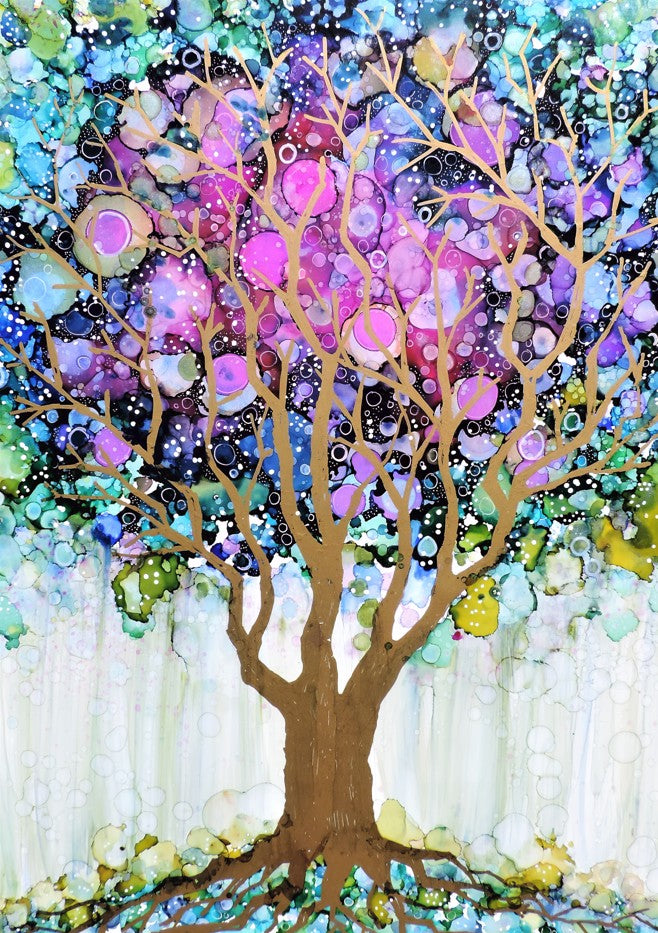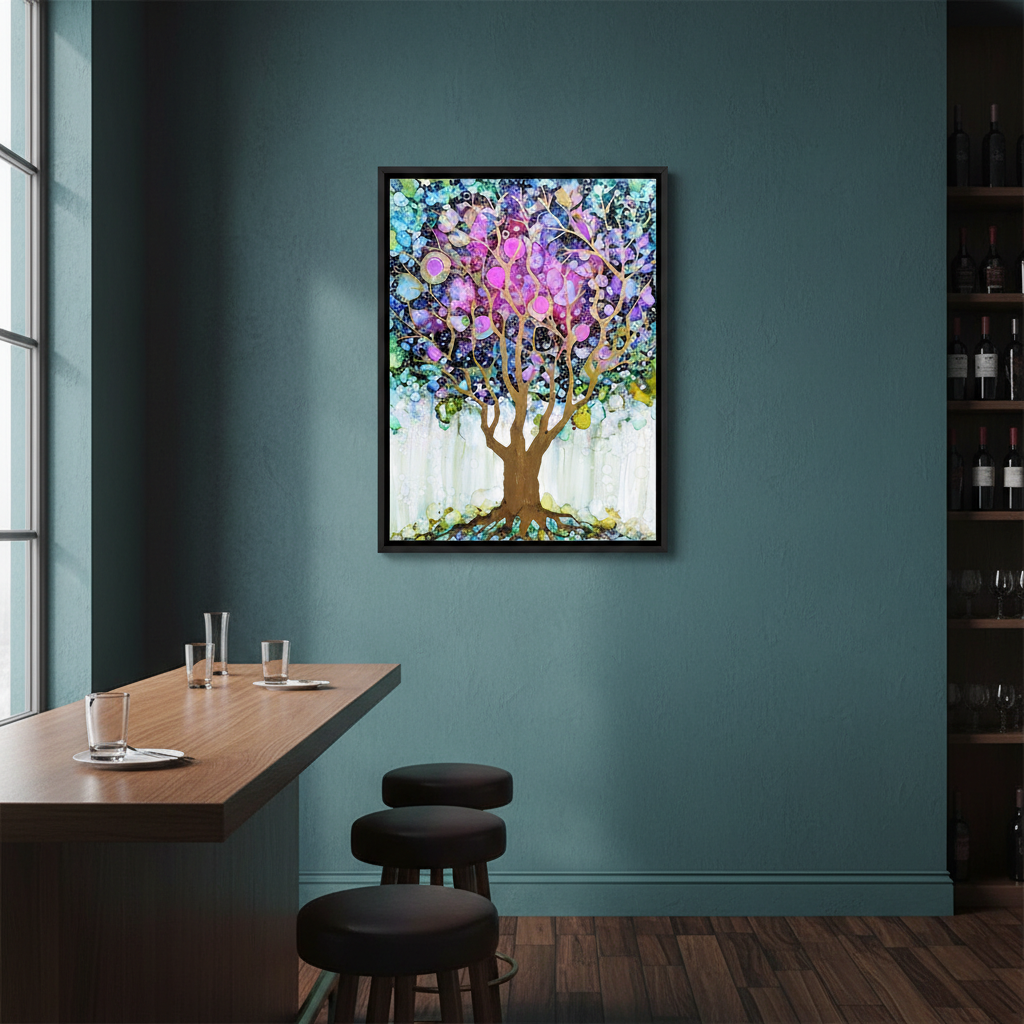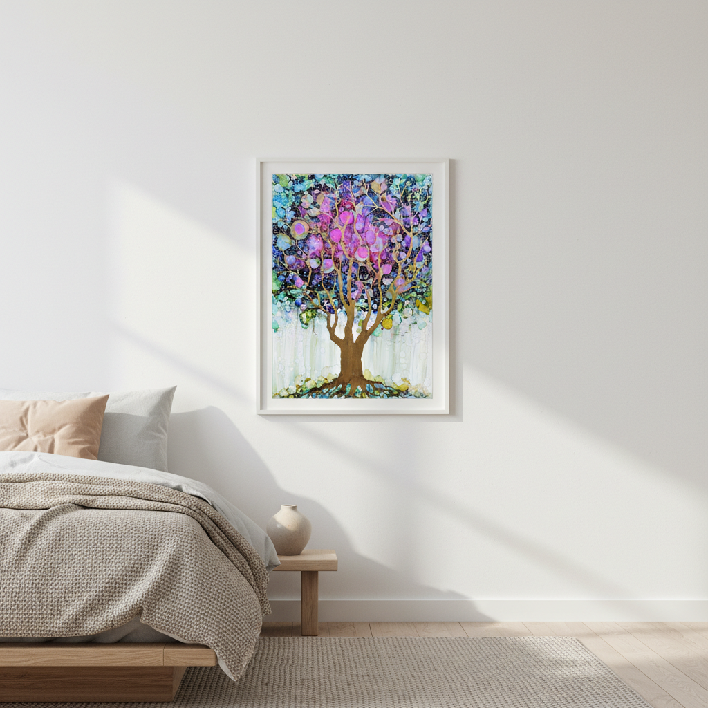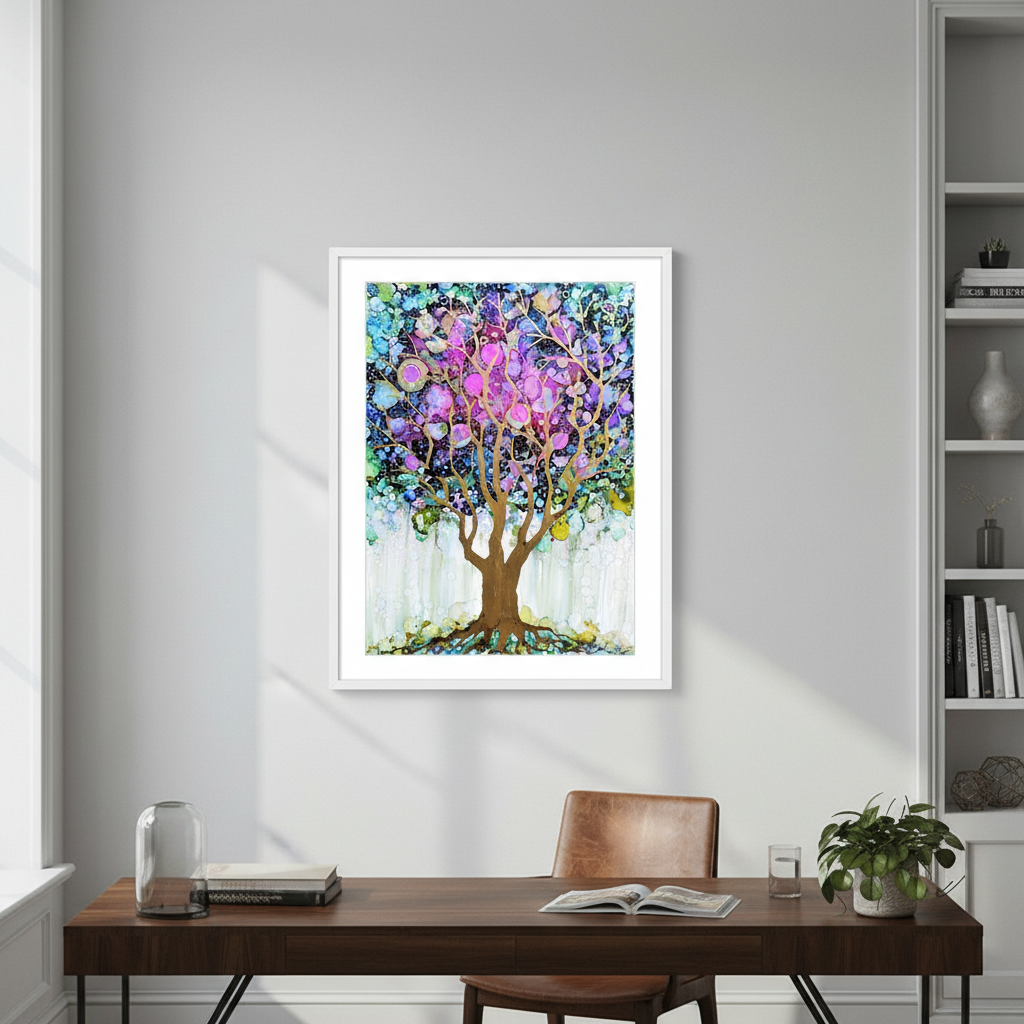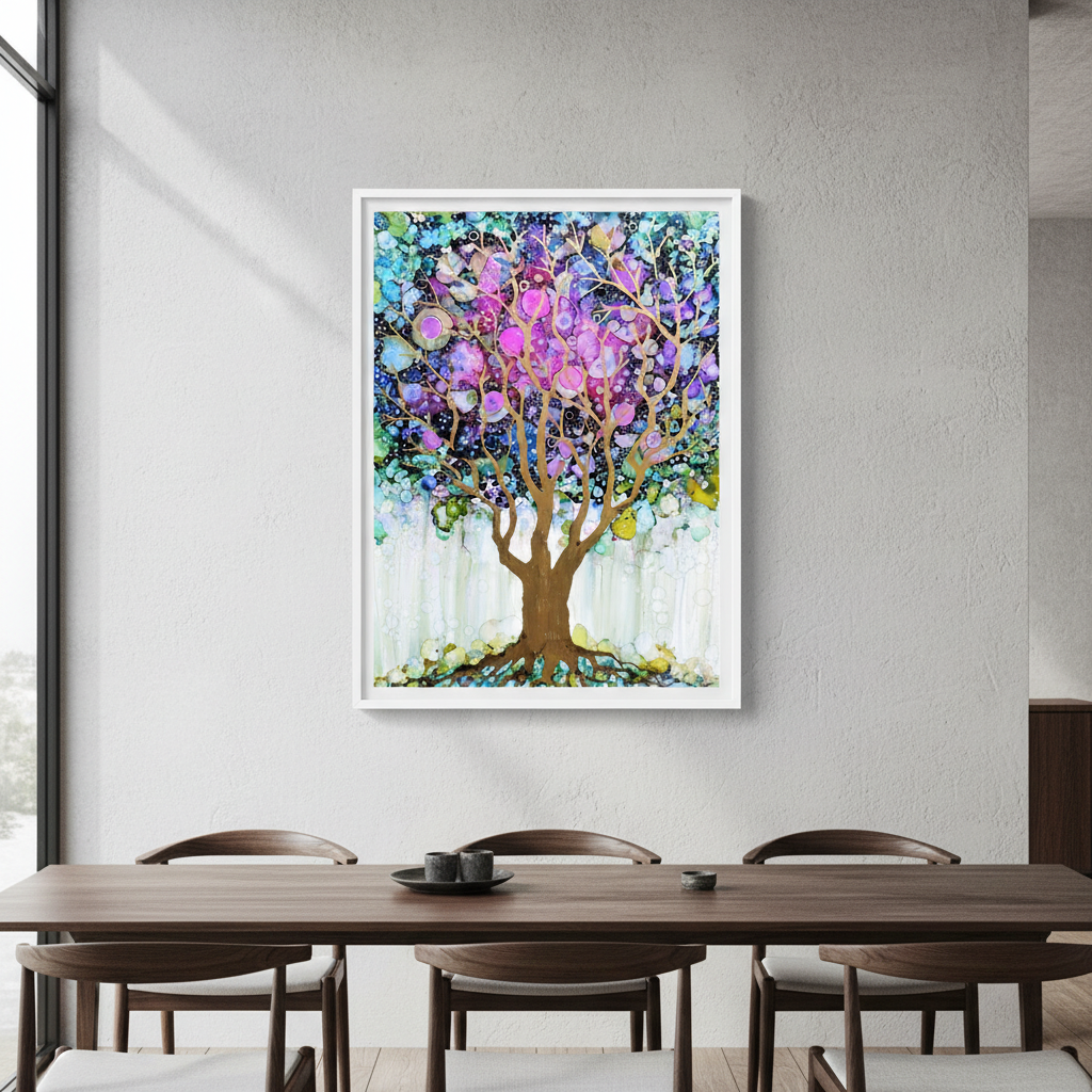 Susciter L'eveil by Sylvie Demers presents a striking composition featuring a vibrant tree rendered with intricate abstract patterns against a pristine white backdrop. This contemporary artwork masterfully blends organic forms with geometric elements, creating visual depth and movement. The interplay of bold colours and detailed linework draws the eye through the composition, making it an engaging focal point for any interior space. Ideal for those seeking statement wall art that combines artistic sophistication with modern design sensibilities, this piece elevates décor through its thoughtful balance of complexity and clarity.