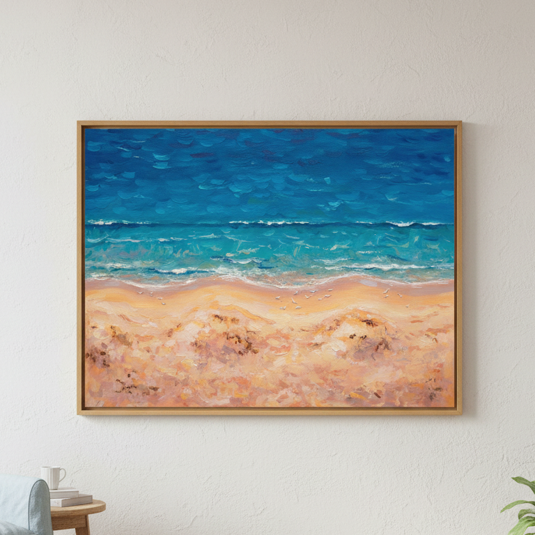 Capture the essence of coastal living with this striking landscape print, rendered in bold, expressive brushstrokes that evoke the raw energy of a seaside vista. Featuring seagulls in flight above a dynamic beach landscape, this artwork delivers gallery-quality depth and movement to any room. The layered, painterly technique creates visual texture that draws the eye, while the coastal palette of blues, sandy tones, and natural hues complements both contemporary and traditional interiors. Perfect for creating a focal point in bedrooms, living spaces, or coastal-inspired settings. A sophisticated choice for collectors seeking authentic artistic character with editorial-quality presentation.