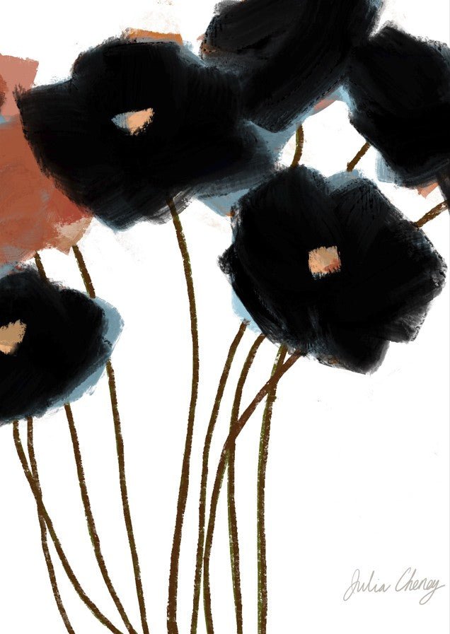 A striking artistic composition featuring delicate black flowers with warm brown stems set against a soft, light background. This elegant piece is signed by the artist, adding authenticity and character to your space.
