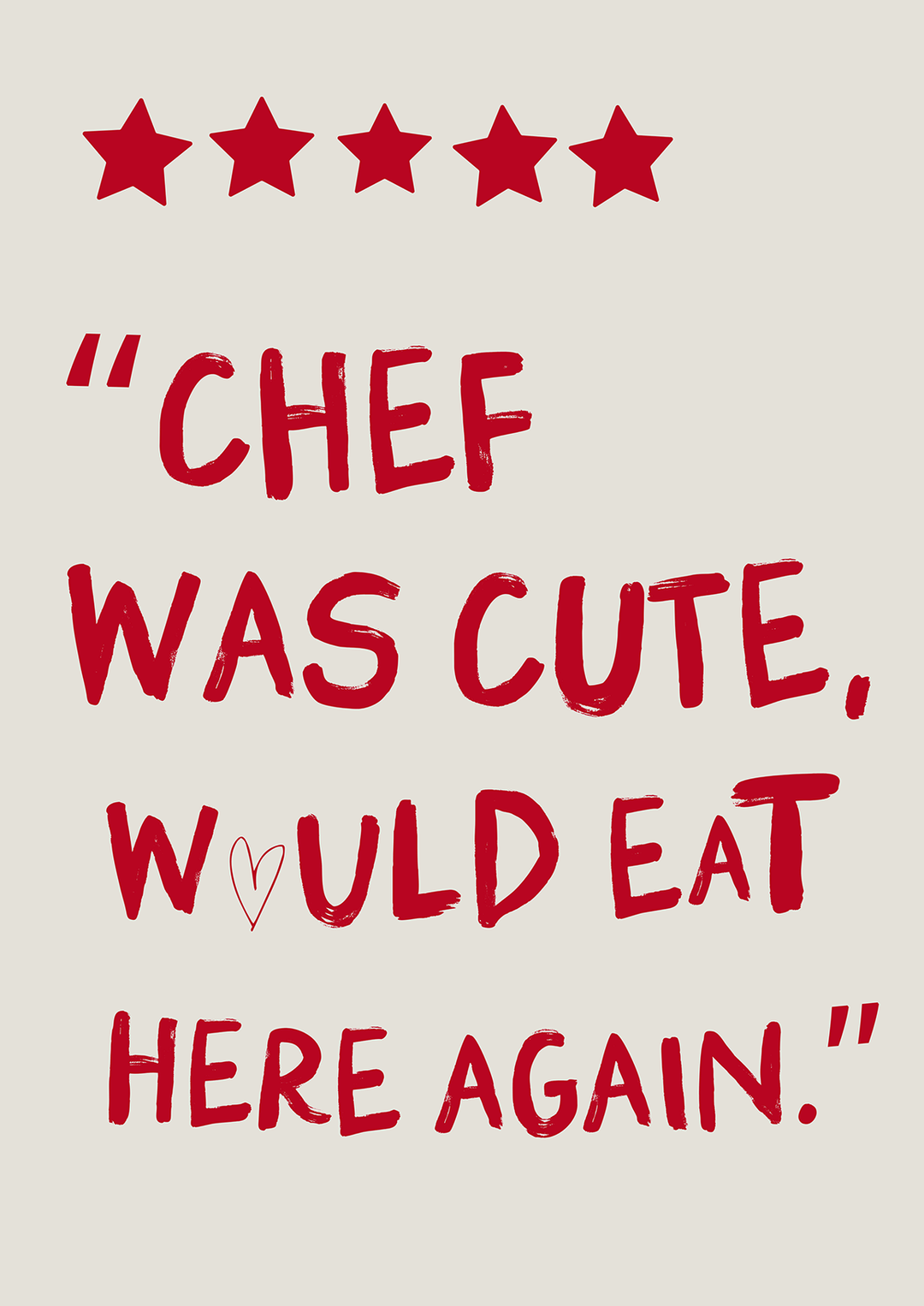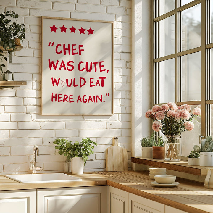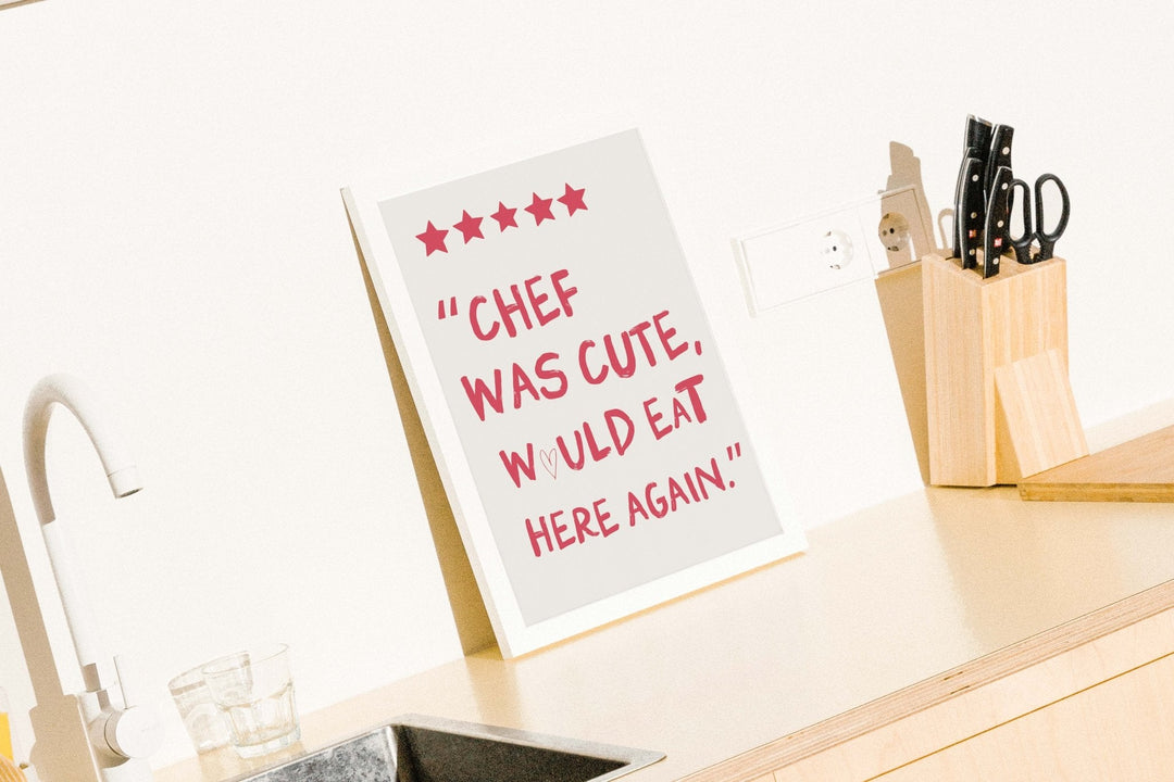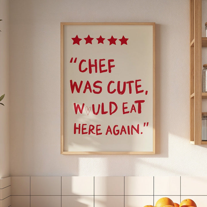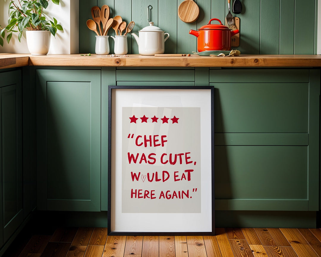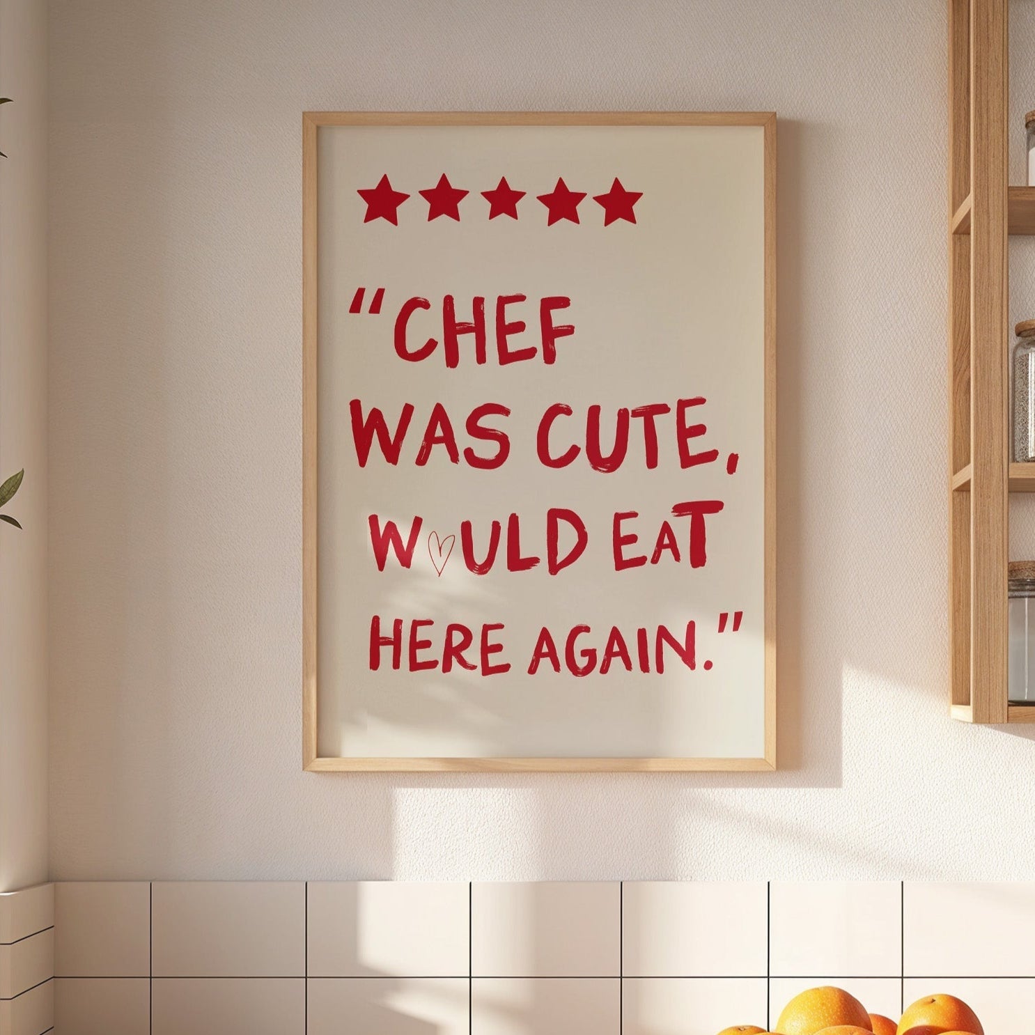 This charming kitchen print features a cute chef and the humorous phrase "Chef was Cute, would eat here again." It is perfect for decorating your living room, kitchen, or bedroom. Fun and stylish, this poster is a must-have for any food lover's home.