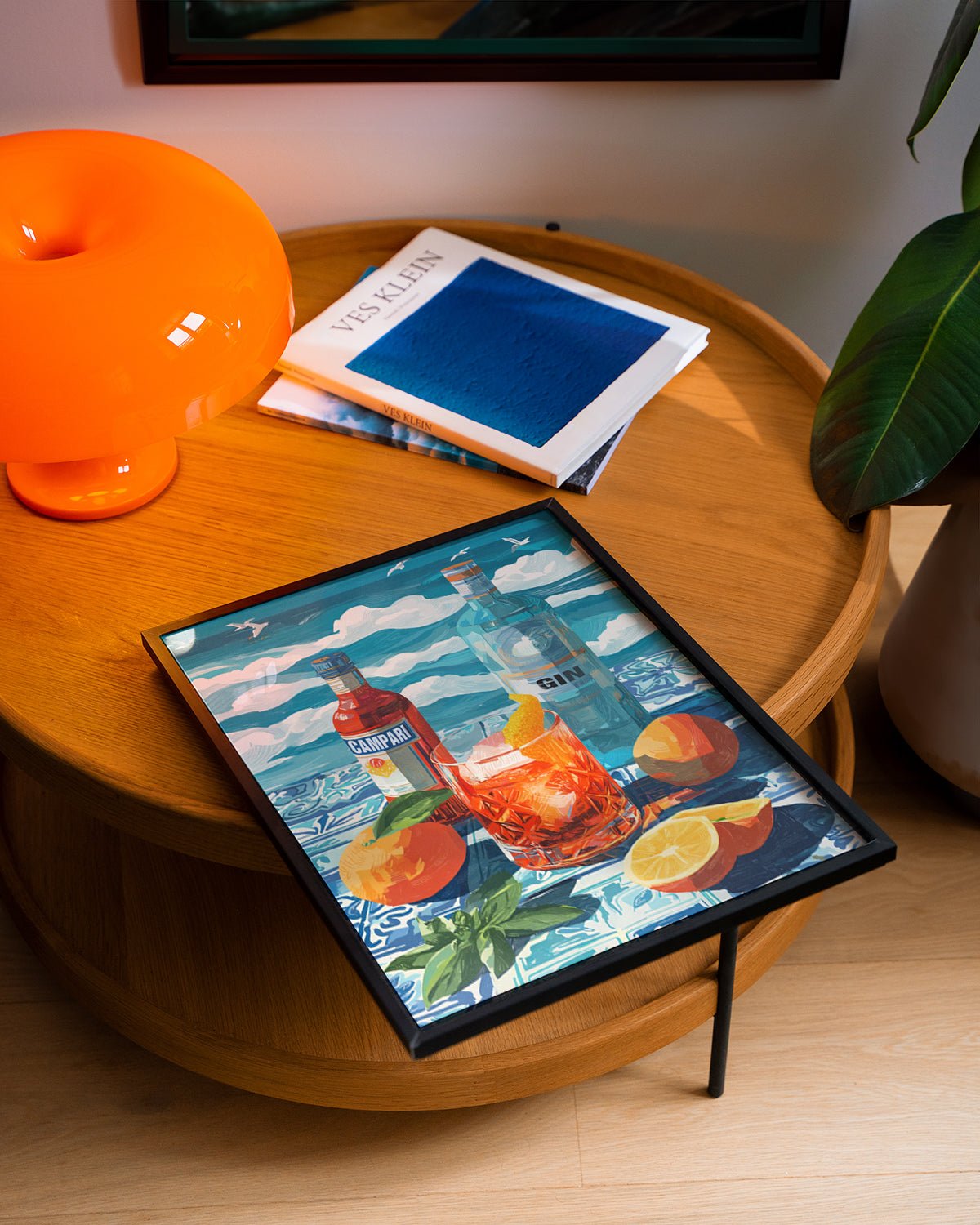 Elevate your living space with the Coastal Negroni Oil Painting Illustration, a sophisticated blend of vibrant coastal hues and classic artistry. Perfect for adding a refined touch to your living room, kitchen, or bedroom, this poster captures the essence of seaside charm with a playful yet elegant flair. Its rich textures and balanced composition make it a timeless piece that enhances any décor with subtle warmth and style.