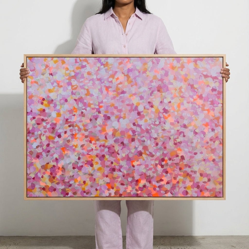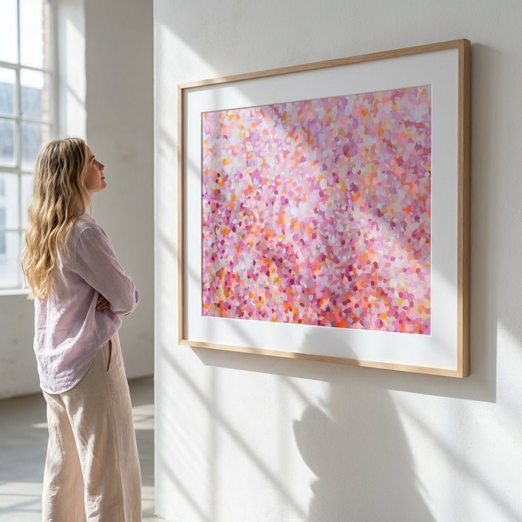 Celebrate vibrant energy with this striking artwork featuring a dynamic multicolored confetti pattern dancing across a soft pink background. The playful composition brings movement and joy to any space, making it an ideal choice for contemporary interiors seeking a bold yet balanced aesthetic. Perfect for adding personality to living areas, bedrooms, or creative workspaces, this piece combines sophisticated colour theory with modern design sensibilities. The contrast between the energetic confetti elements and the calming pink base creates visual interest without overwhelming the senses, ensuring it complements both minimalist and eclectic décor schemes.