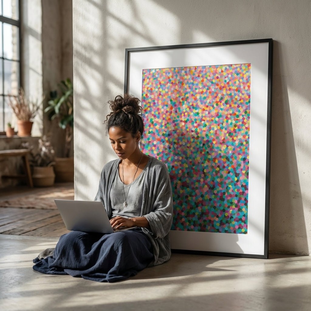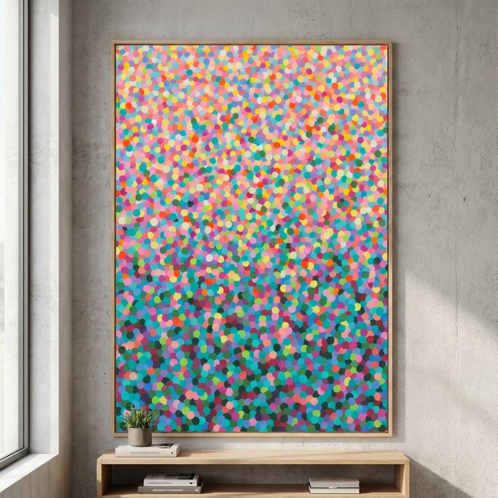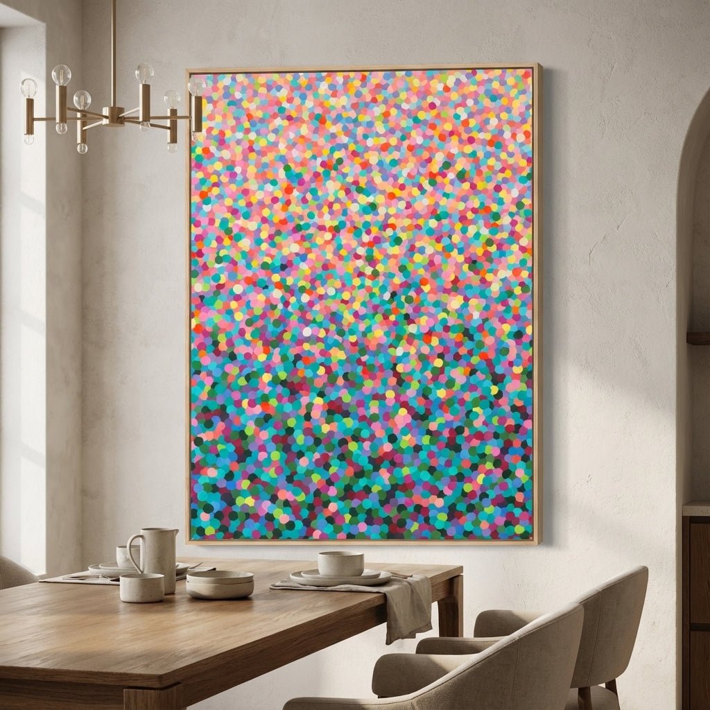 Flowers Portrait by Katherine Spiller showcases a striking composition featuring a multicolored polka dot pattern that adds contemporary flair to any interior space. This artwork combines botanical elegance with modern geometric design, creating visual interest through the interplay of vibrant dots and floral elements. Perfect for those seeking to introduce colour and personality to their walls, this piece works beautifully in living areas, bedrooms, or creative spaces. The expert execution and thoughtful colour palette ensure it complements both minimalist and eclectic décor schemes.