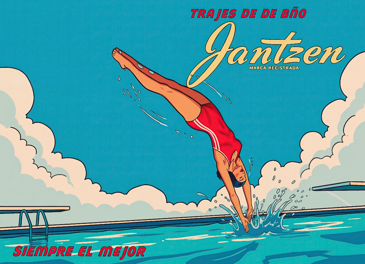 Dive into mid-century nostalgia with this striking Janzten vintage diving advertisement poster. Featuring a bold, editorial-style illustration of a woman in classic swimwear, this piece captures the golden age of coastal leisure and retro advertising aesthetics. Perfect for beach houses, vintage-inspired interiors, or collectors of authentic mid-century ephemera, it brings timeless glamour and cultural heritage to any space. The rich colour palette and dynamic composition make it a conversation-starting focal point that celebrates vintage fashion and seaside culture.