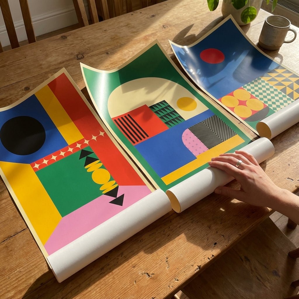 Transform your space with this striking trio of geometric abstract prints, each showcasing bold, contemporary design. The collection features three distinct compositions: vibrant shapes in warm tones against a serene beige backdrop, dynamic colorful elements on a sophisticated green canvas, and an energetic mix of circles, checks, and triangles in primary hues on a striking blue ground. Perfect for modern interiors, these prints layer visual interest while maintaining cohesive aesthetic appeal. Ideal for gallery walls, home offices, or living spaces seeking artistic character without overwhelming the senses.