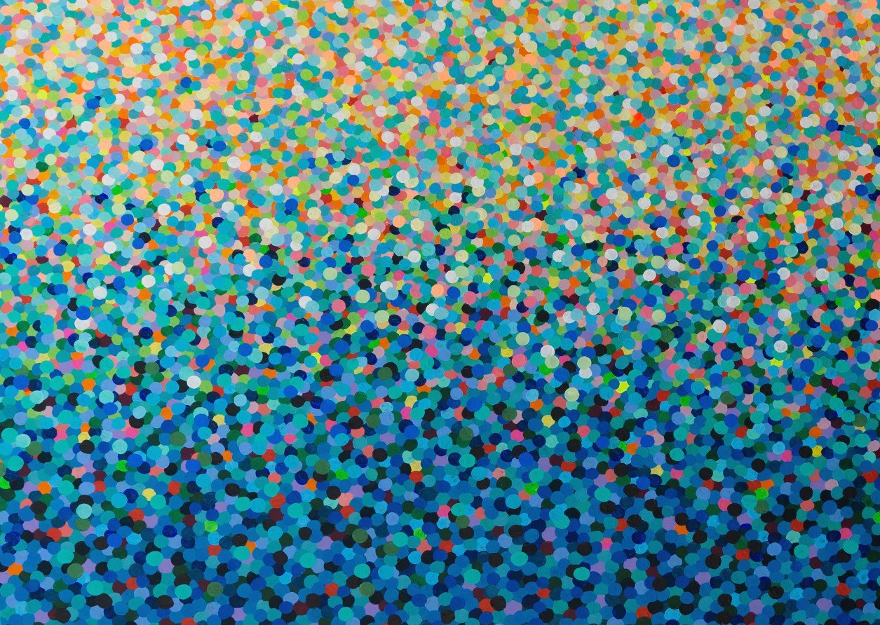 Sunlight on the Sea Landscape captures the interplay of light and colour through a sophisticated multicoloured dot pattern set against a serene blue background. This contemporary artwork by Katherine Spiller employs pointillist techniques to evoke the shimmering quality of sunlight reflecting across water. The carefully composed palette creates visual depth and movement, making it an engaging focal point for any interior space. Ideal for those seeking modern art that combines technical skill with contemplative aesthetics.